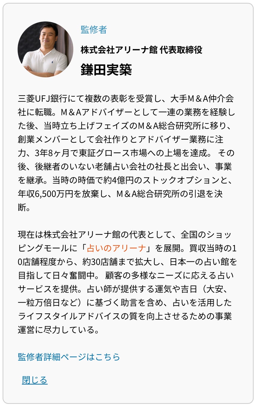 M&Aアドバイザーから占い事業の継承者へ。株式会社アリーナ館 代表・鎌田 実築氏が『アプデ』の監修者に就任[4人目]
