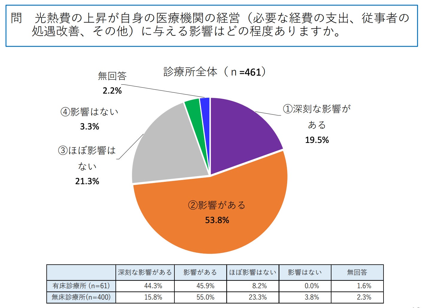 日本医師会が実施した「診療所の光熱費の変動に関する実態調査」の結果によると、「1施設当たり電気料金」については、有床診療所で2022年12月分の前年同月比で23万2134円増加となり、仮に1年間続けば、270万円ほどの上昇となる。無床診療所では、2022年12月分の前年同月比で4万3969円増加となり、仮に1年間続けば、50万円ほど上昇することからも、7割を超える診療所から、「経営に影響がある」との回答がありました。