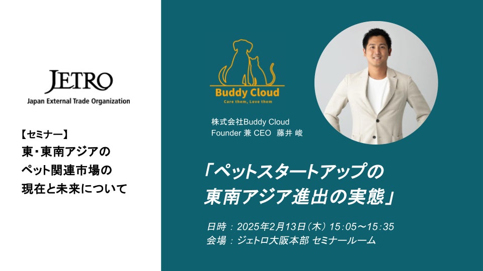 株式会社BuddyCloud(本社:東京都港区、代表取締役社長:藤井峻)は、2025年2月13日(木)に日本貿易振興機構(JETRO)が主催するセミナー「東・東南アジアのペット関連市場の現在と未来について」に登壇することをお知らせいたします。