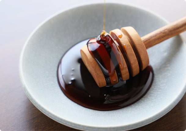 キャラメル×黒蜜を使ったオリジナルソース「キャラ蜜」を別添え。コクをプラスして風味を引き立ててくれる「キャラ蜜」は、食べ始めからかけるのはもちろん、途中で味をアレンジして楽しむこともできます。隠し味には、生薬を配合したお屠蘇を入れているので、香りよく体に優しい味わいになっています。