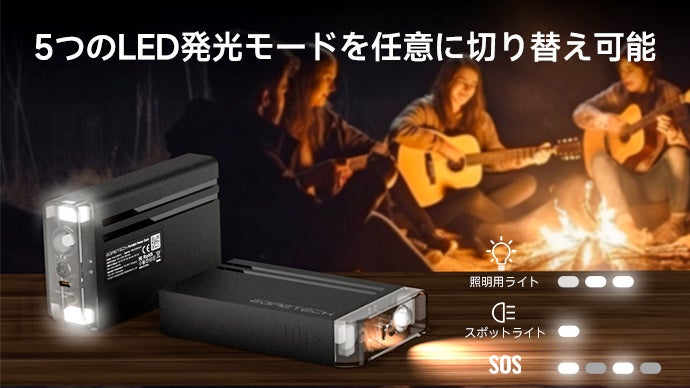 バッテリーにLEDライトを搭載。5つのLED点灯モード(アンビエントライト低・中・高・スポットライト・SOS)で用途に合わせて使用できます。
