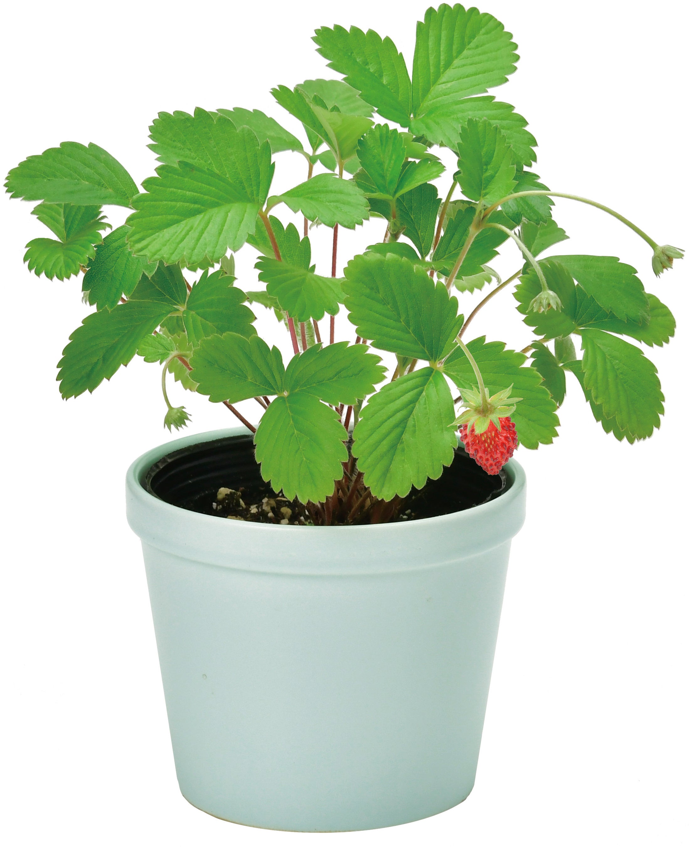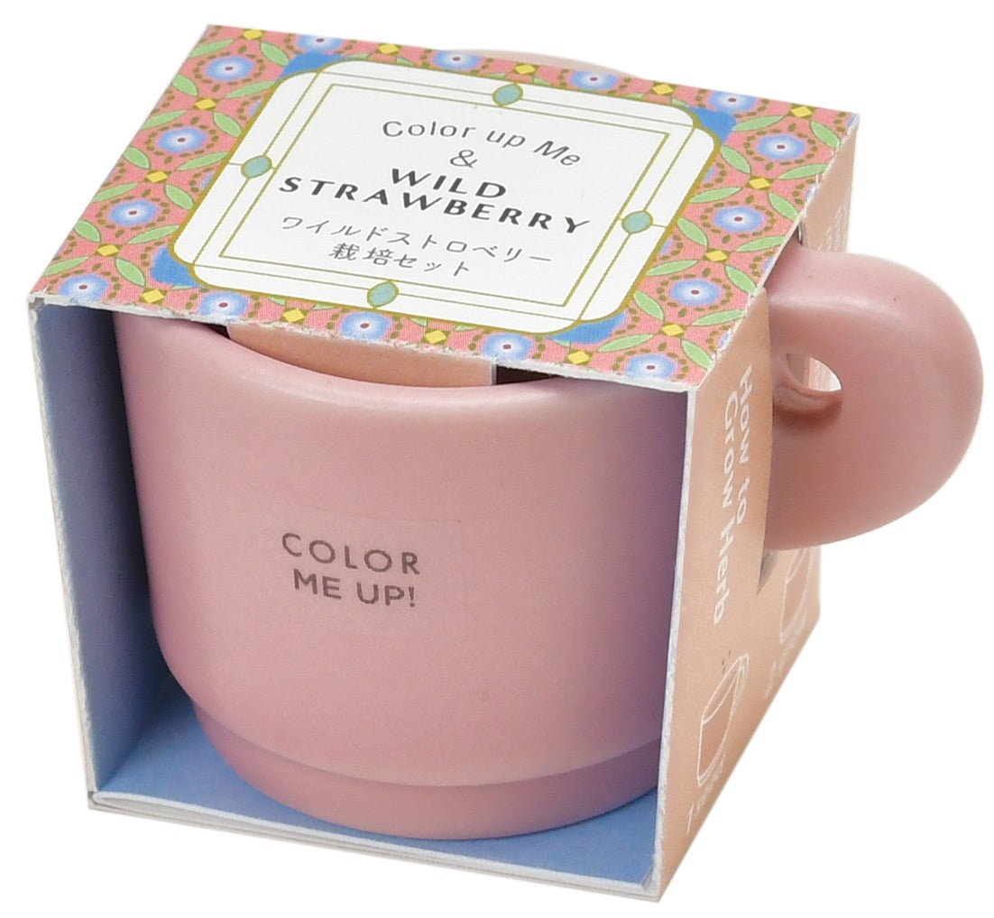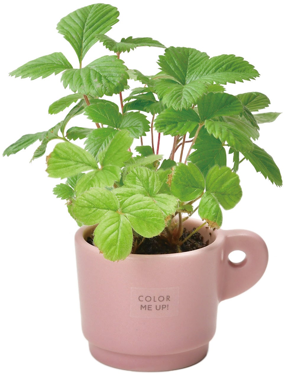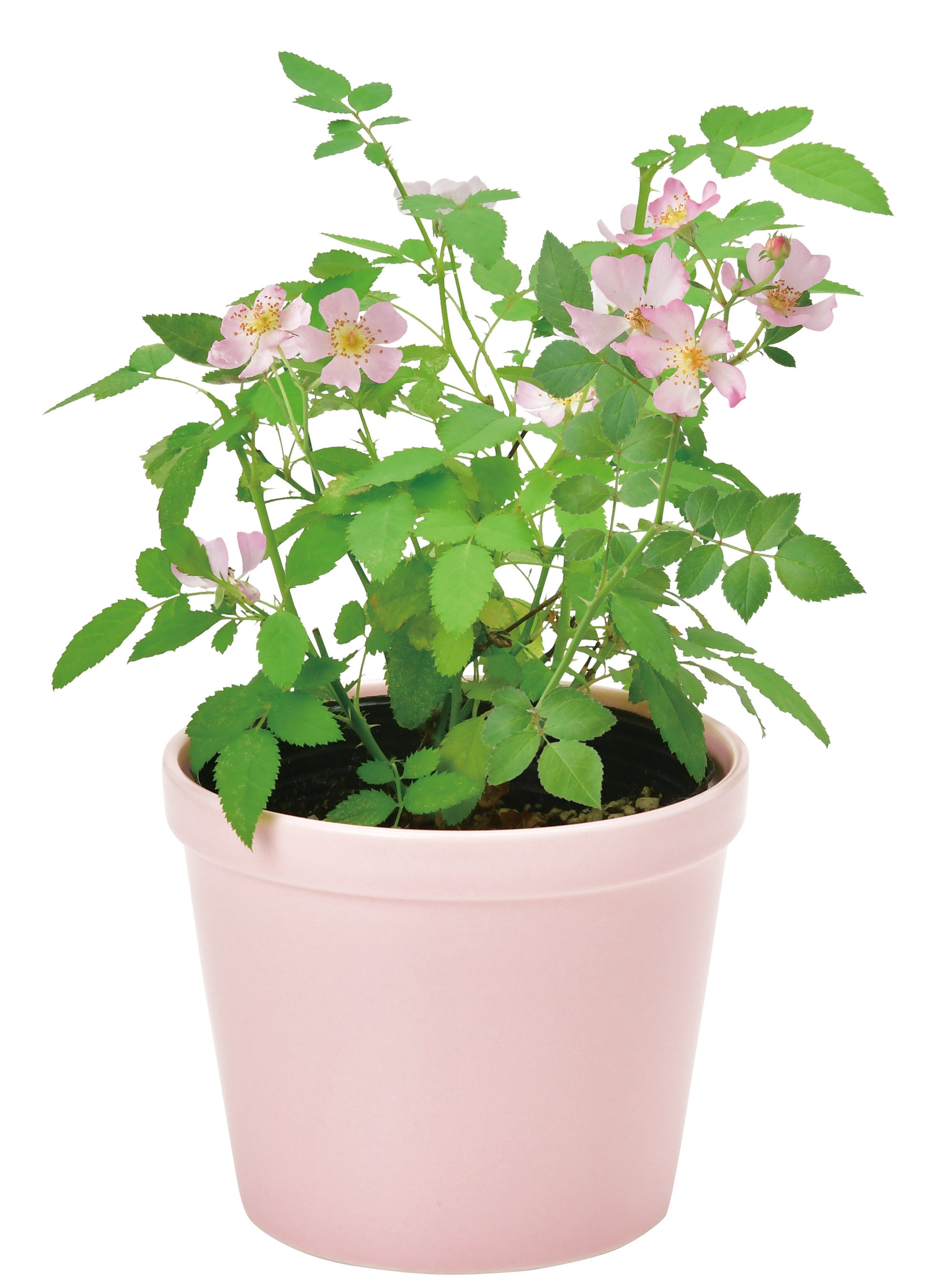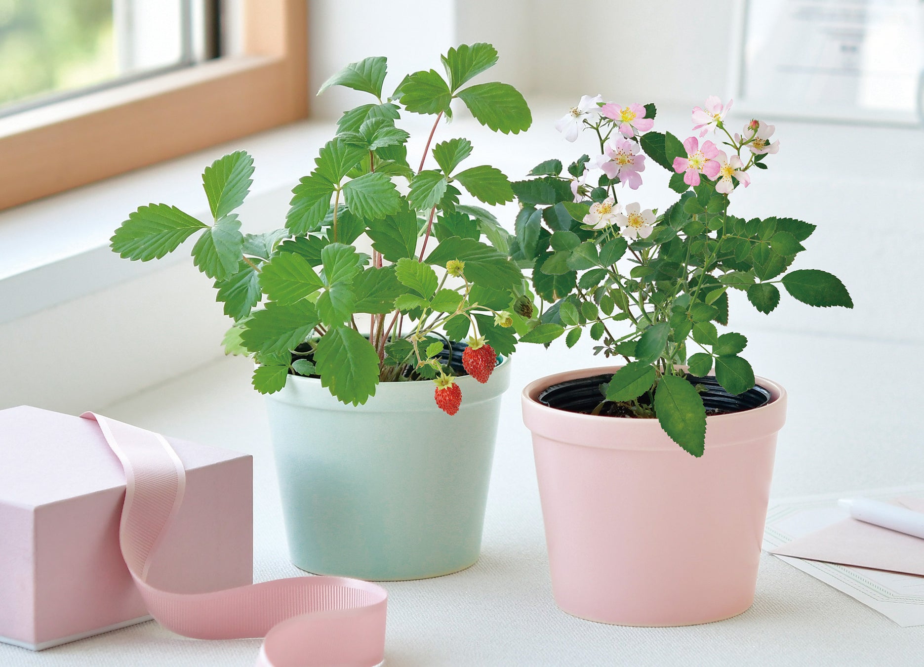 パステルカラーの美濃焼ポットでワイルドストロベリー・ミニバラを育てます。