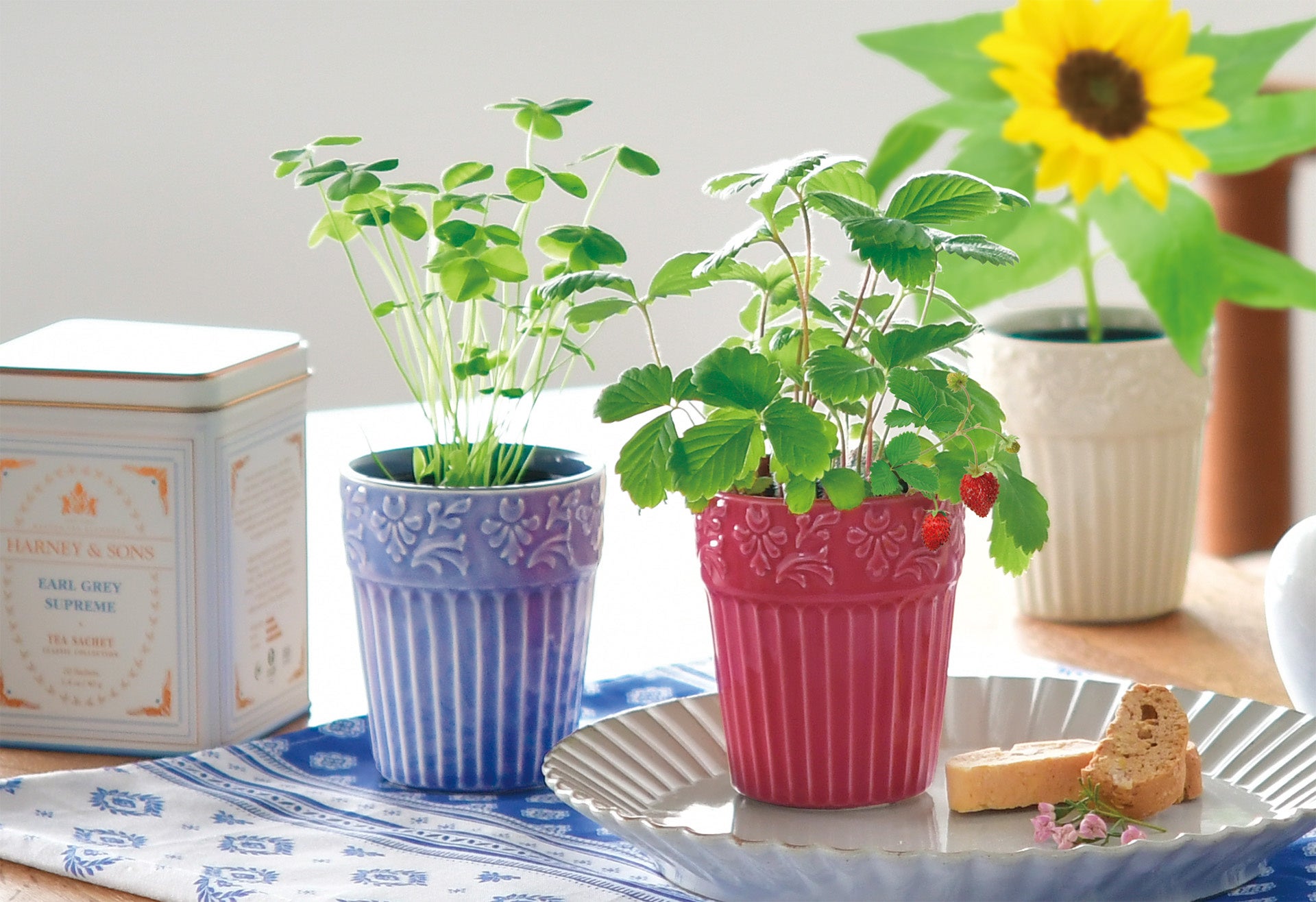 陶器のポットには、エンボス加工で繊細なレリーフを美しく施し、上品な大人カラーを厳選。『Grace Garden』は、笑顔になれる「ハッピーな植物」を育てる栽培キットです。