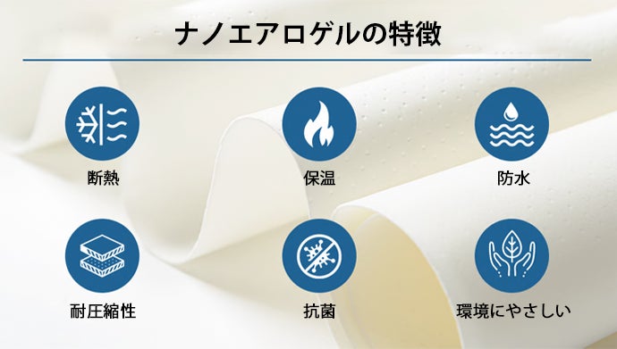 ナノエアロゲルは、空気の0.026W/m・Kを超える0.013W/m・Kの熱伝導率を有する低密度で多孔質ナノ材料であり、比較的に狭いスペースでももっと小さい重量で優れた断熱性を実現します。これは、今まで最も低い熱伝導率、最も軽い固体材料として認知されています。