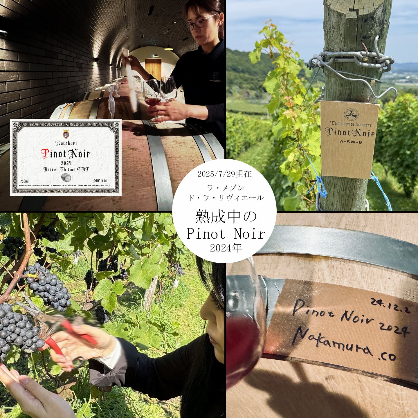 ラ・メゾン・ド・ラ・リヴィエールは、(株)中村プロモーション(代表中村雅人)が手がける北海道発のブランド。2024年のピノ・ノワールは、シャンベルタンを熟成させた樽を使用しました
