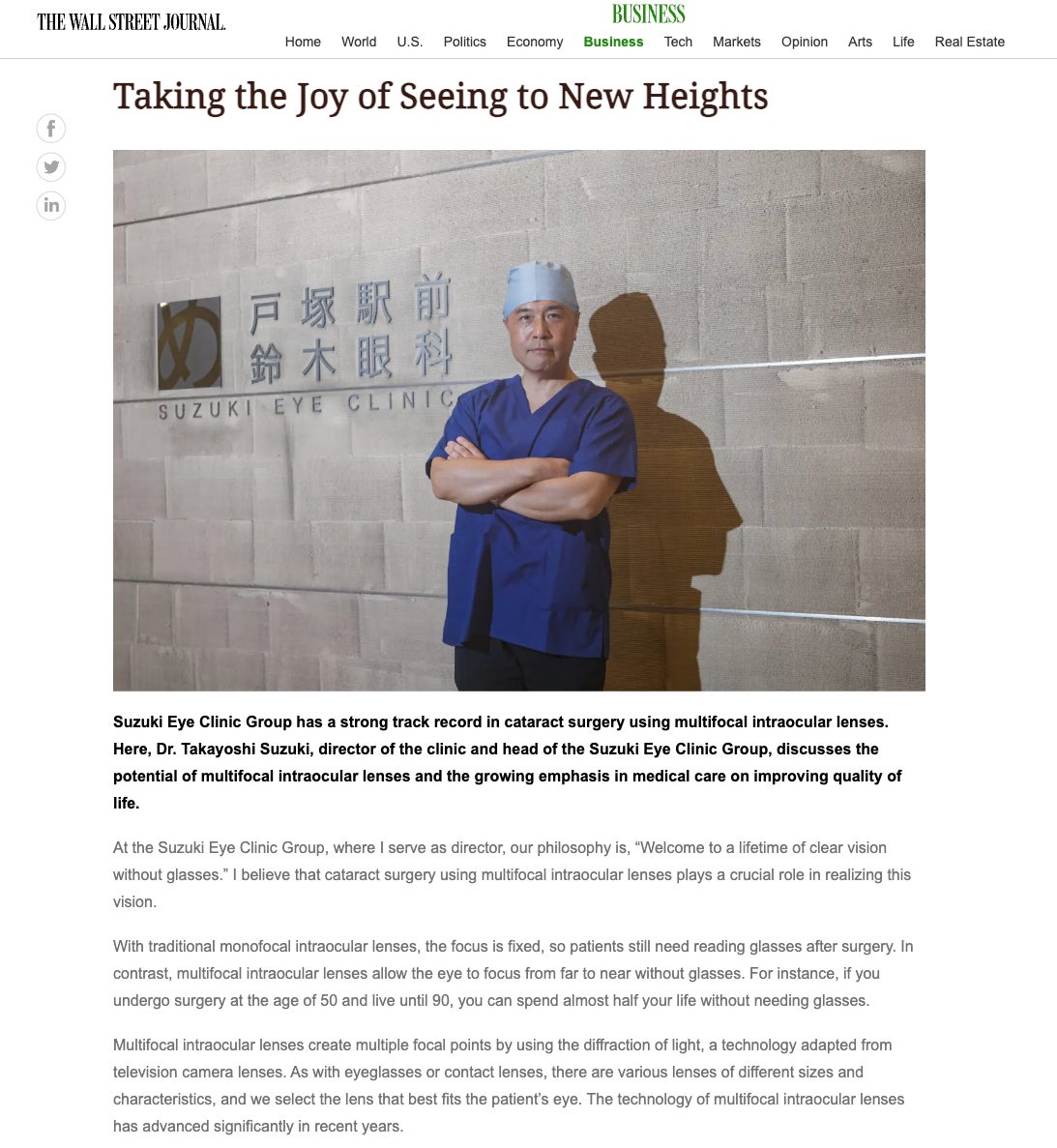 老眼・近視の治療である多焦点眼内レンズ治療を展開する鈴木眼科グループ(本社:神奈川県横浜市、理事長:鈴木高佳、以下 鈴木眼科)は、国際的に影響力のある米国メディア「THE WALL STREET JOURNAL」のコーナー「Next Era Leaders」に理事長の鈴木高佳の記事が11月より公開されたことをご報告いたします。