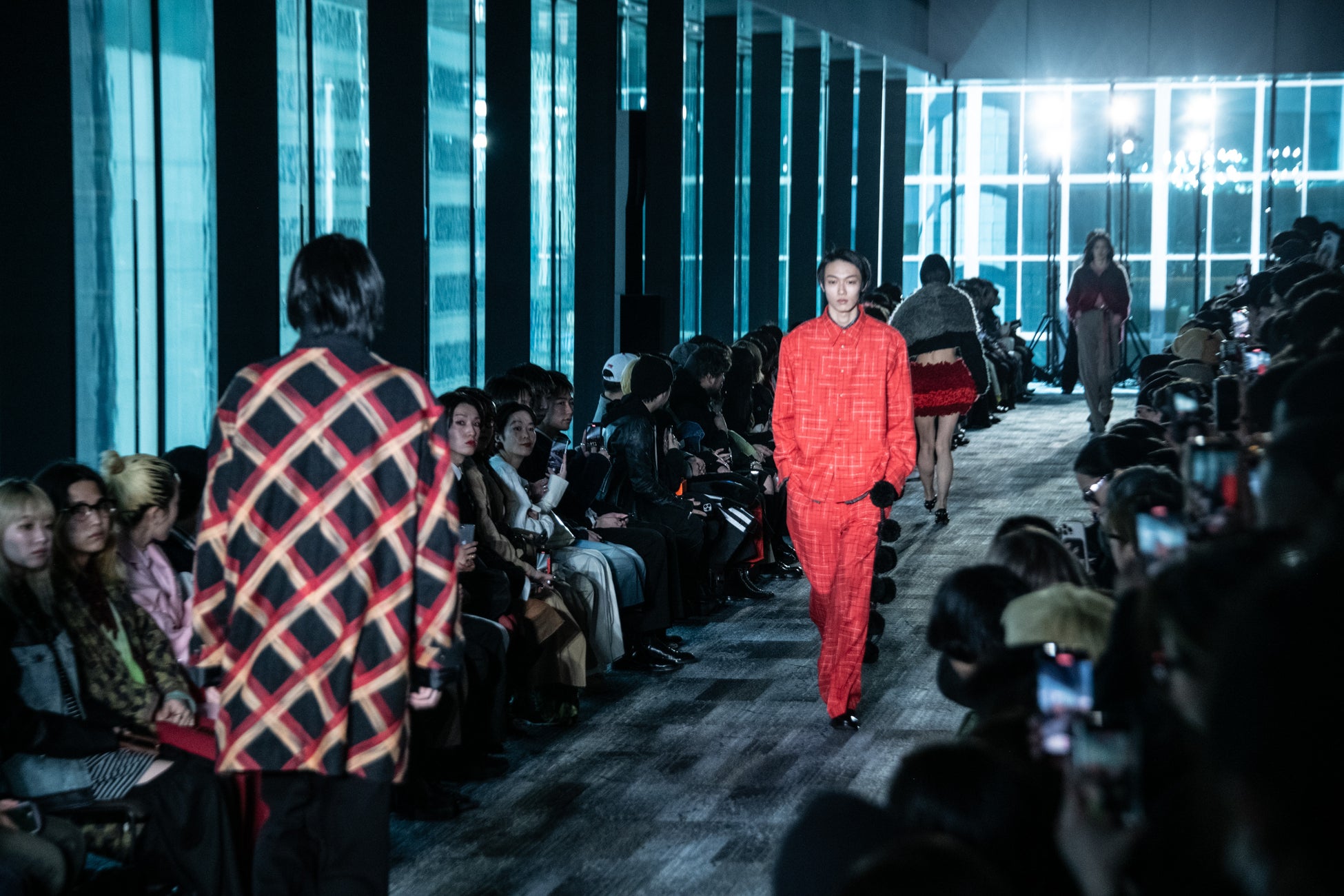 本日のTODA HALL & CONFERENCE TOKYOでの最初のショーは、TOKYO FASHION AWARD 2025受賞ブランドの1つ「SATORU SASAKI」。ブランドとして初となるランウェイを開催し、“Primitive Future”をテーマに、赤やオレンジをキーカラーに、力強いコレクションを披露しました。
