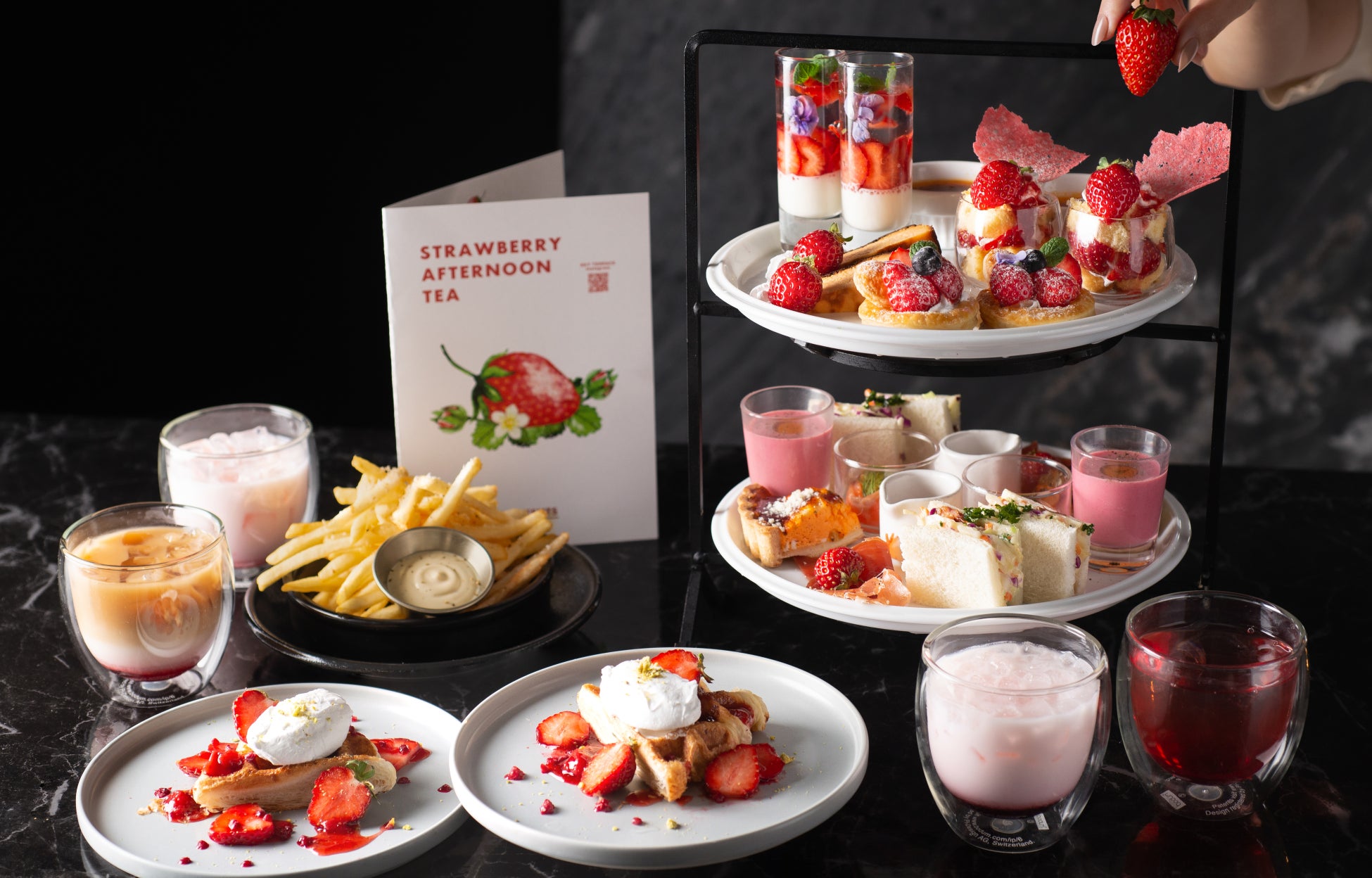 スタンド上段には、チュイルが華やかな、苺とフロマージュブランのトライフルや、桜香る苺のキャラメルパイ、苺とモヒートシロップジュレ パンナコッタ2層仕立てなど苺づくしの全5種のガトーがラインナップ。セイボリーには苺ビネガーソースをかけて食べる苺と生ハムや、京都産卵「濃紅」を使ったキッシュ、中でも人気のトリュフマヨをディップして食べるフライドポテトは絶品です。春を彩る口福なメニューラインナップにはさらに、高級紅茶スティーブンスミスティーメーカー・ロースタリー直送コーヒーや茶師が厳選した日本茶(放香堂)などがフリーフローでお楽しみいただける全長10メートルの世界一のドリンクバー(商品名:ビバレッジバー)が付いており、時間無制限で優雅な春のティータイムを堪能していただけます。