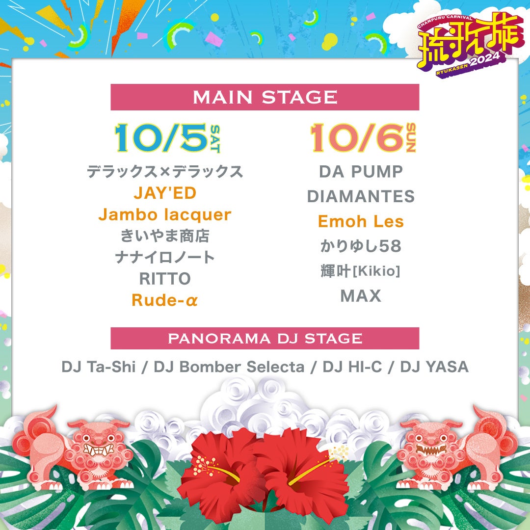 第四弾ではメインステージアーティストとして、SNSで先行告知済みの「 かりゆし58 」をはじめ、Rude-a、JAY’ED、Emoh Les、Jambo lacquerの4組の追加が決定いたしました。また「琉歌旋 CHAMPURU CARNIVAL 2024」では、『 踊れる 』野外フェスとして、メインステージの転換時間にDJタイムを設けています。野外音楽フェス好きの間で人気を誇るPANORAMA DJブースを設置し、最高の音質でDJプレイをお楽しみいただけます。