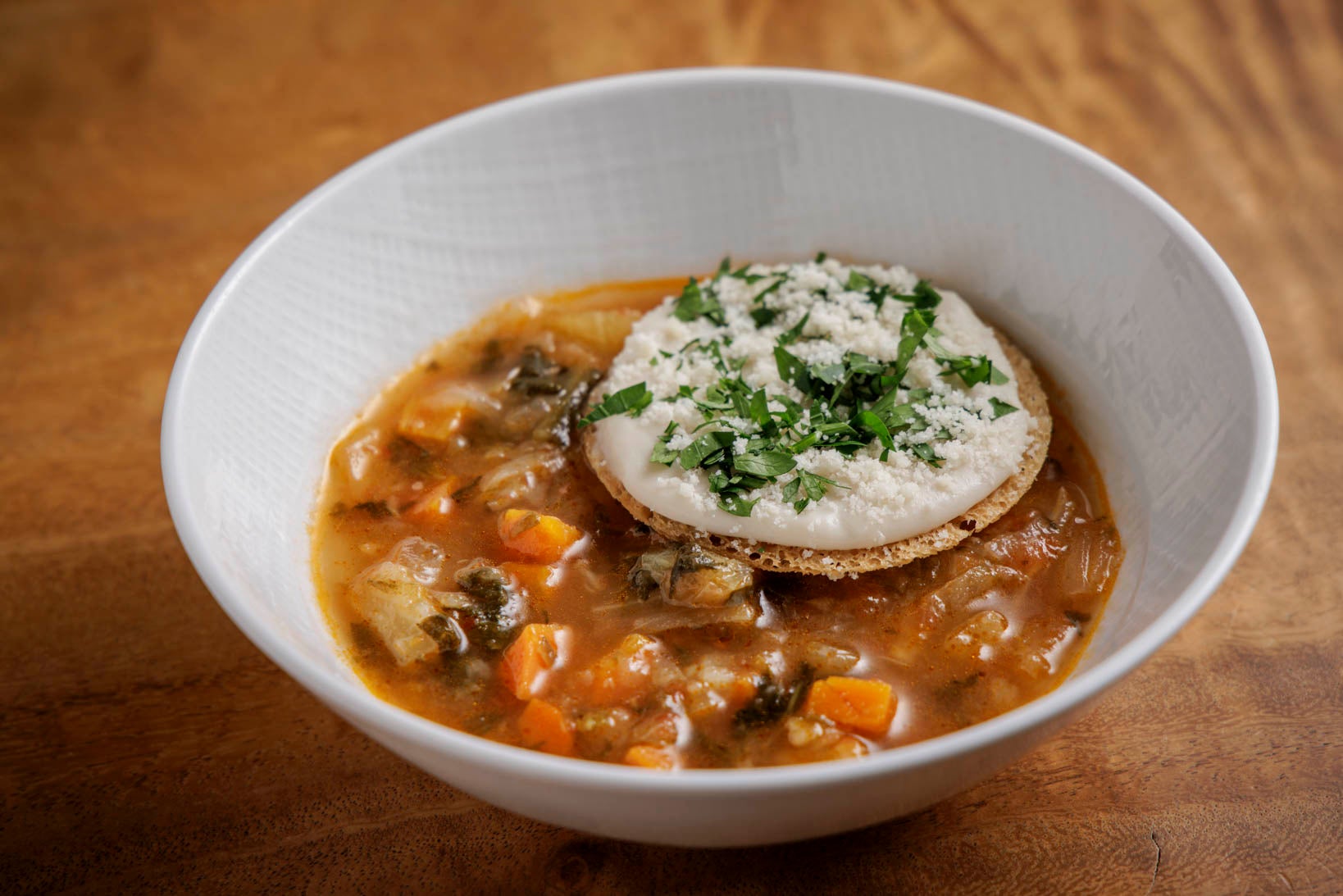 フォーシーズンズホテル東京大手町のイタリアン「PIGNETO」のシェフ監修。イタリアのトスカーナ地方の伝統的な野菜スープで、白いんげん豆のトーストとパルミジャーノチーズをトッピング。白いんげん豆のほっくりとした食感と、パルミジャーノチーズの豊かな風味が調和し、心も体も温まる一品です。 |