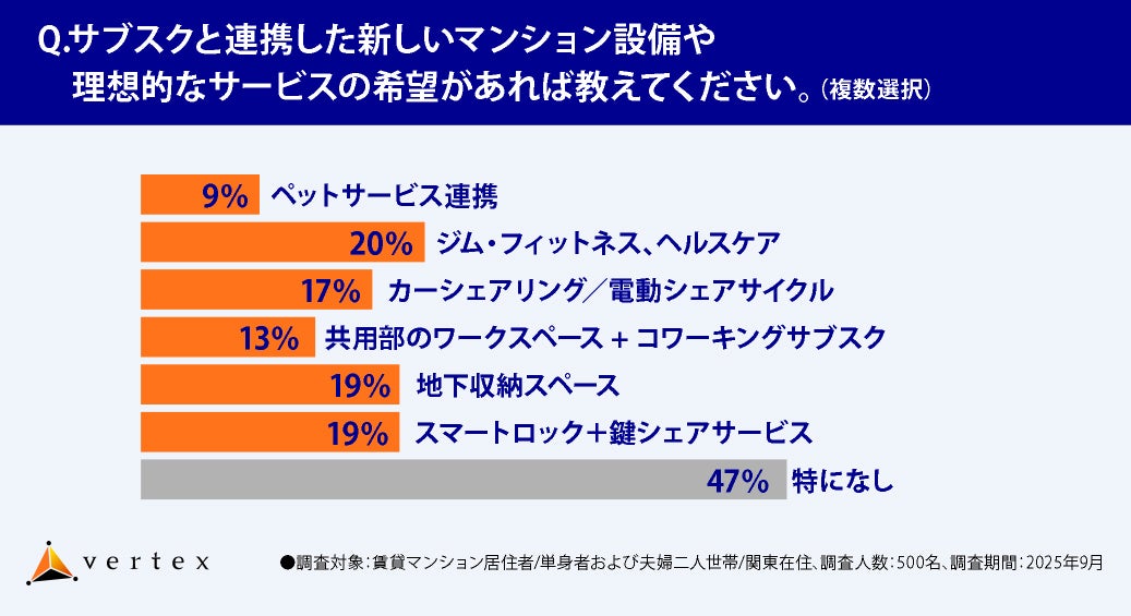 株式会社ベルテックス(所在地:東京都新宿区、代表取締役:梶尾 祐司)は、近年多様な付帯サービス導入で競争が激化する賃貸マンション市場を背景に、おもに首都圏の賃貸マンションに居住する単身者および夫婦二人世帯に対し、サブスクリプションサービスに関する意識調査を実施しました。