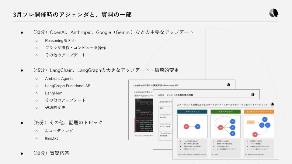 OpenAIやAnthropicなどのモデルプロバイダーやLangChainなどのフレームワークのアップデートに追従するため、最新情報をまとめて解説する定期セミナーです。 -