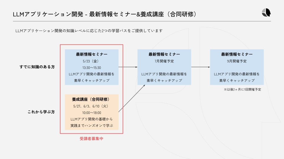 「LLMアプリケーション開発 - 最新情報セミナー」(5月23日)および「LLMアプリケーション開発者養成講座(合同研修)」(5月27日〜)の詳細は以下のWebサイトでご確認ください。