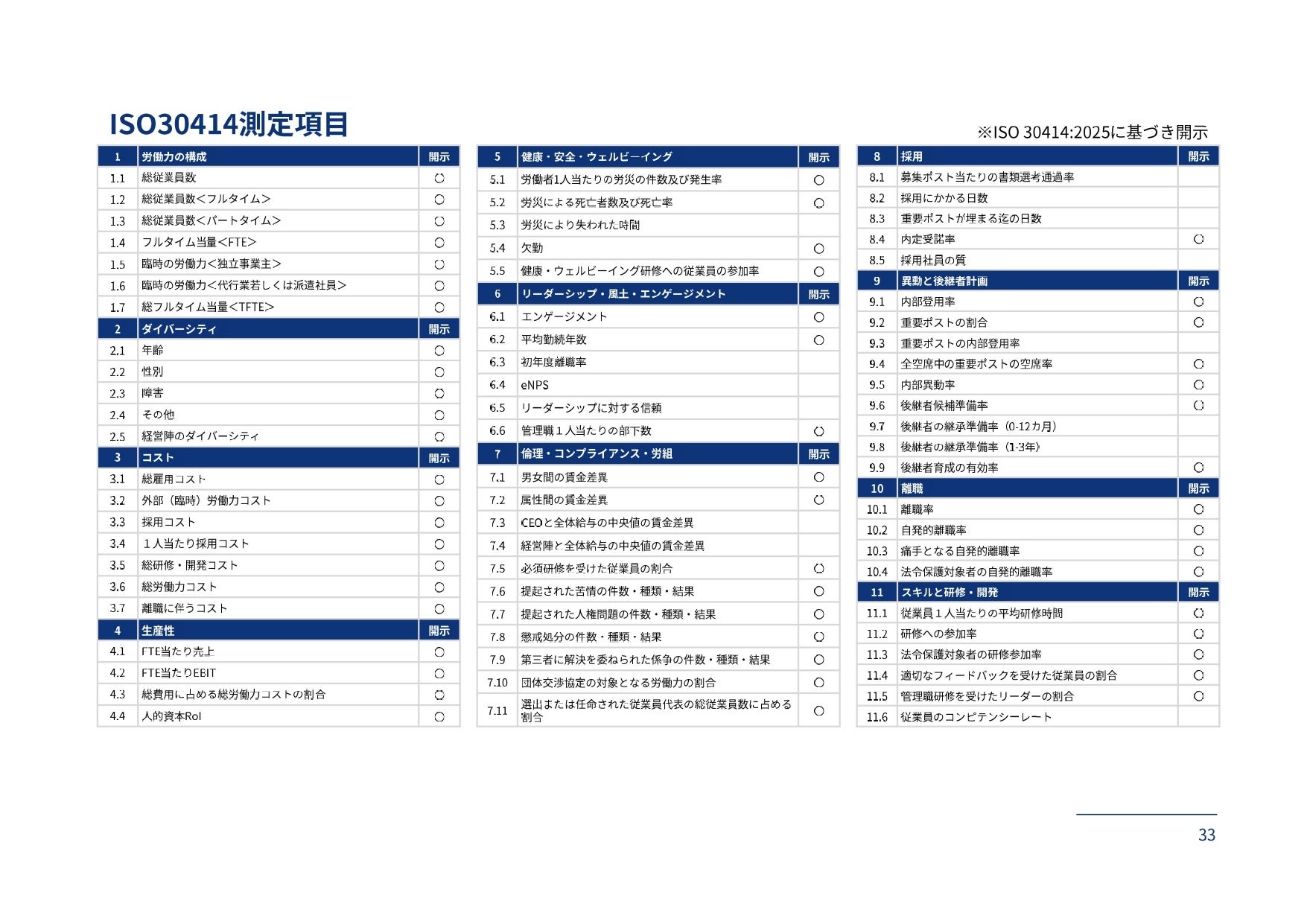 本レポートでは、ISO 30414:2025で定義される69指標のうち55指標を開示しています。