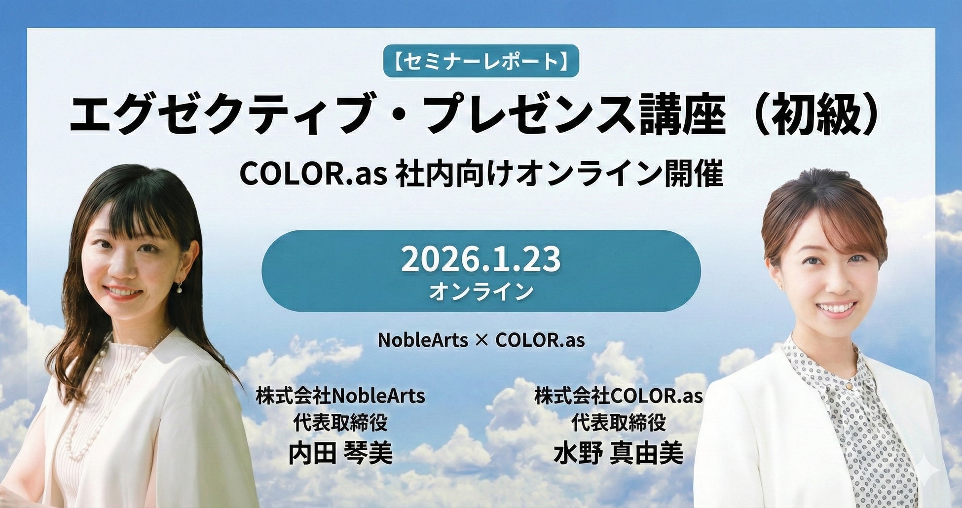 株式会社Noble Arts(所在地:東京都港区、代表取締役社長:内田琴美)は、2026年1月23日(金)、株式会社COLOR.as主催の社内向けセミナーに当社代表の内田が登壇し、「エグゼクティブ・プレゼンス講座(初級)」を実施いたしました。