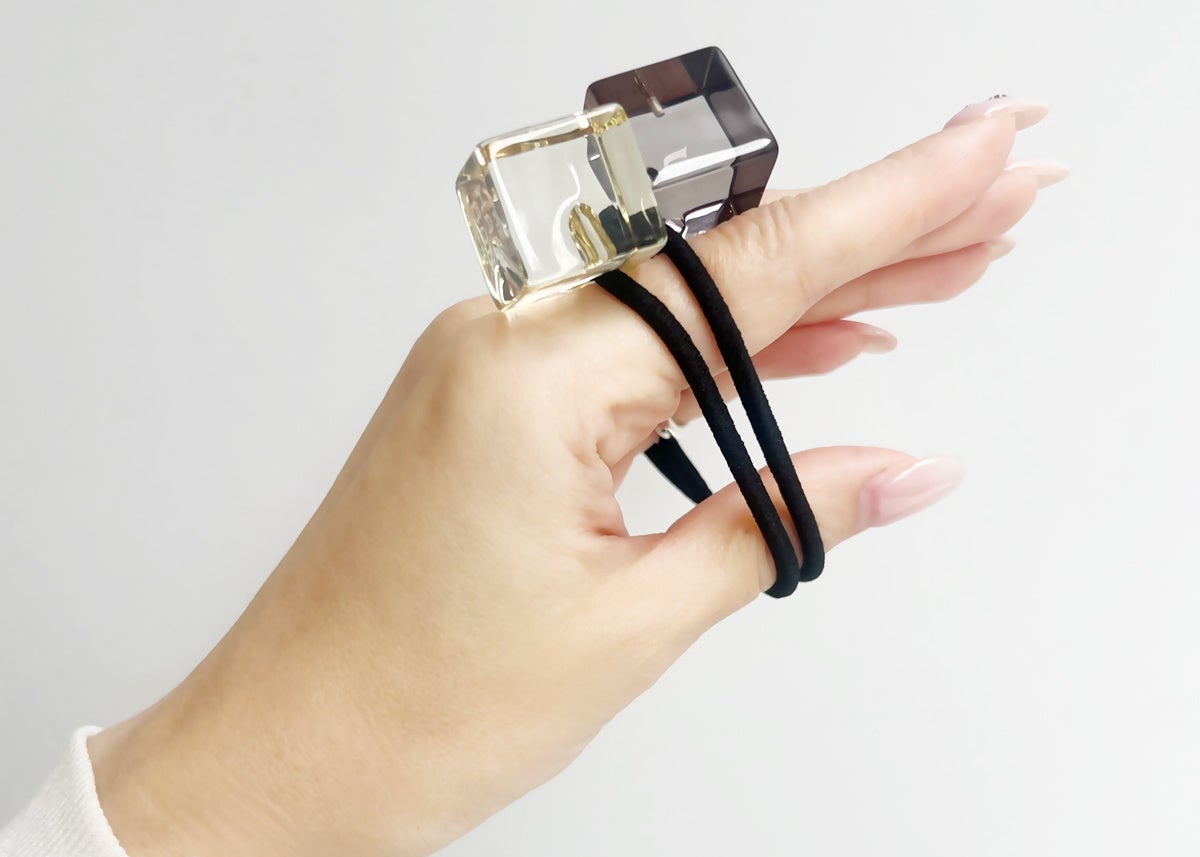 オーナメントを上部にまとめ、中心から左右に分かれるループを重ねて手に通すことで、通常のポニーの方法と同様に髪を束ねることができます。<THE HAIR BAR TOKYO>オリジナルのシングルオーナメントのポニーは、すべて2重のループが基本仕様。