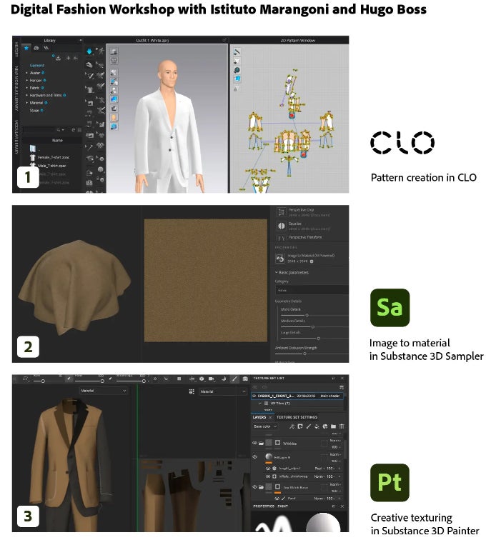 今回のワークショップは、デジタルファッションデザインの可能性を拡大することを目的として実施されました。 学生たちは、Hugo Bossの実務ノウハウとAdobeの最先端技術、特にヨーロッパのファッション教育界ではまだ広く使用されていないAdobe Substance 3Dを活用し、デジタルパターンの制作やテクスチャリングを学びました。 Istituto Marangoniは、このツールをイタリアの教育機関として初めてカリキュラムに導入し、デジタルファッション教育の先駆者としての地位を確立しています。 ワークショップのクライマックスは、学生たちがHugo Boss本社で直接デザインを発表する機会でした。この場にはHugo Bossの専門家たちが参加し、特にIstituto Marangoniの卒業生であり、Hugo Bossの3Dデザインチームリーダーを務めるCristina Souto Cavigliaも出席し、特別な意義が加わりました。