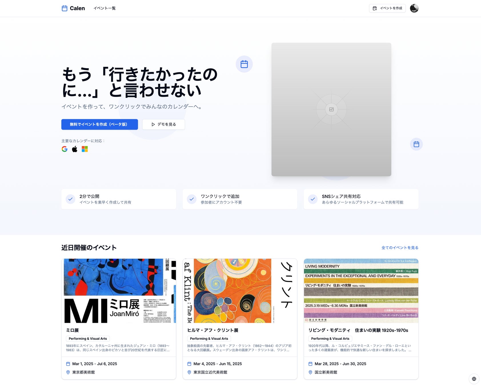 Calenは、イベントの作成から共有、そして参加までを、これまでになく簡単に行えるように設計されたプラットフォームです。2025年3月にベータ版としてリリース以来、多くのユーザー様からのフィードバックを反映し、この度日本語版として正式にサービスを開始いたしました。