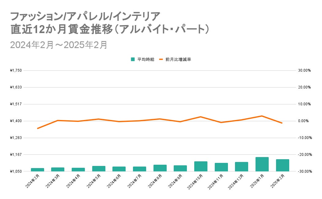 1位の「建設/土木/エネルギー」と13位の「ファッション/アパレル/インテリア」における直近12か月の賃金推移を比較すると、2025年1月度のランキングで最下位だった「建設/土木/エネルギー」の賃金はV字回復を見せました。複数の企業が建設現場における高時給案件を多数出稿したことが影響しています。