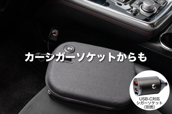 停電時はモバイルバッテリーやポータブル電源から、車中泊時はシガーソケットから使えます。