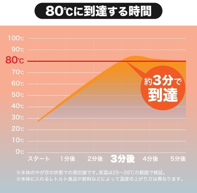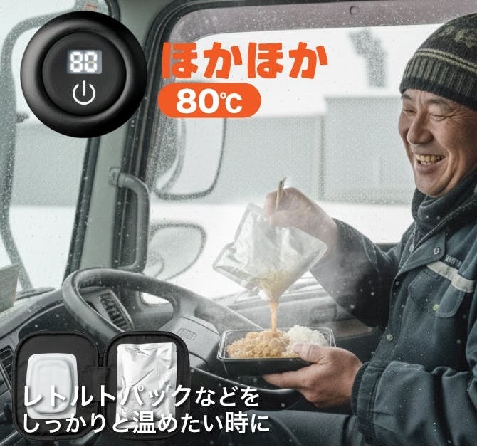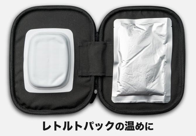 レトルト食品やパックご飯を、火も水も電子レンジも使わず、約3分で80℃まで加熱できるコンパクトなヒーティングユニットです。