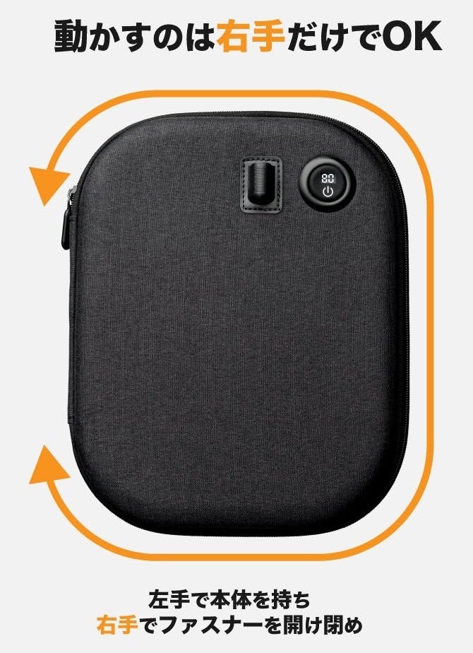 左手で本体を持ちながら、ファスナーの開閉・食品の出し入れ・ボタン操作のすべてを右手一つで完結できる設計を採用。