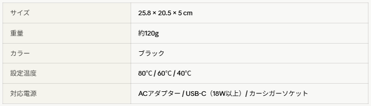 設定温度は80℃・60℃・40℃の3段階。ボタン一つで温度を即時変更でき、LEDインジケーターで暗い場所でも確認できます。