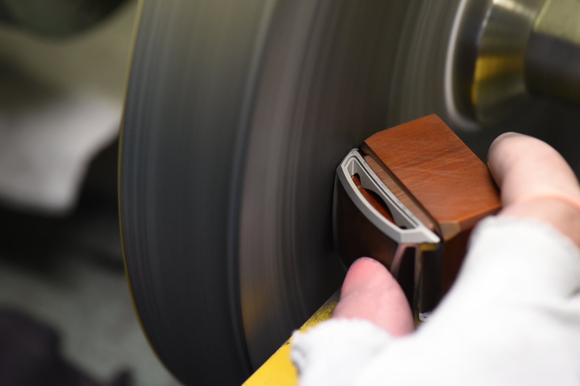 SEVEN WINDOWSのもう一つの特徴は日本刀の刃先のようにエッジが立ったケースの稜線。滑らかさと鋭角さという対立する美しさを手作業によって追い込んでいくザラツ研磨技術はまさに神業の領域です。