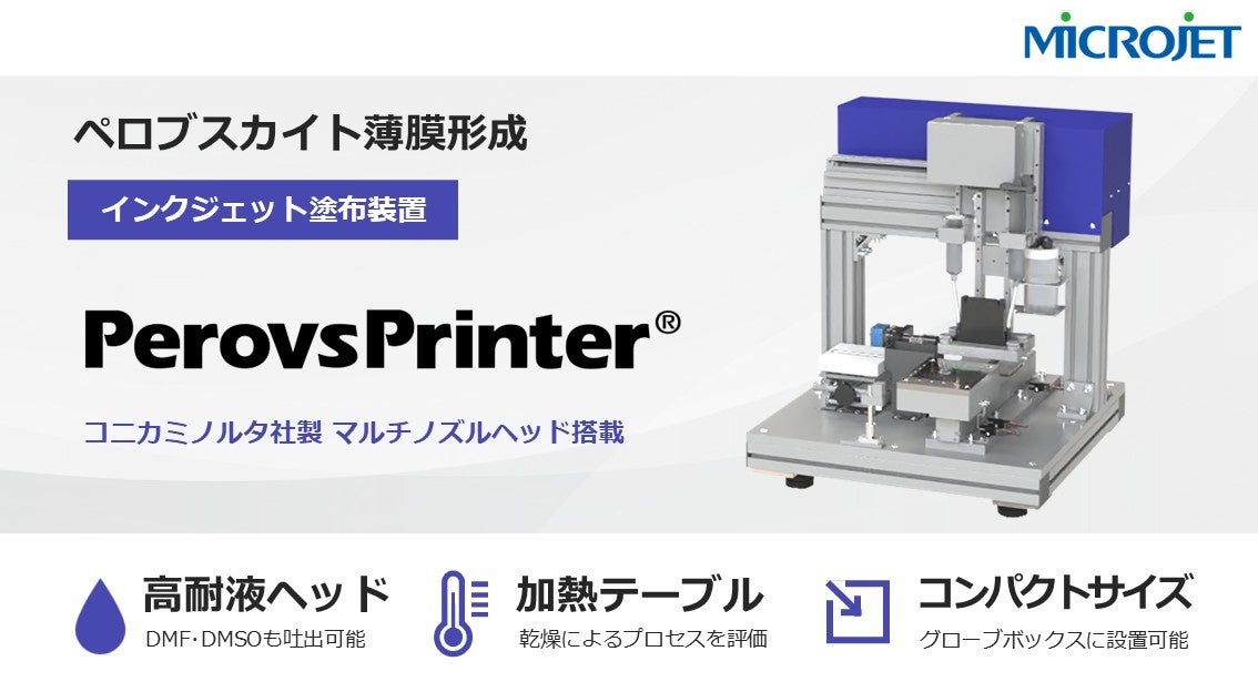 株式会社マイクロジェット(本社:長野県塩尻市、代表取締役:山口 修一)は、ペロブスカイト溶液に対応した高耐液のペロブスカイト太陽電池試作用インクジェット塗布装置を販売開始いたします。