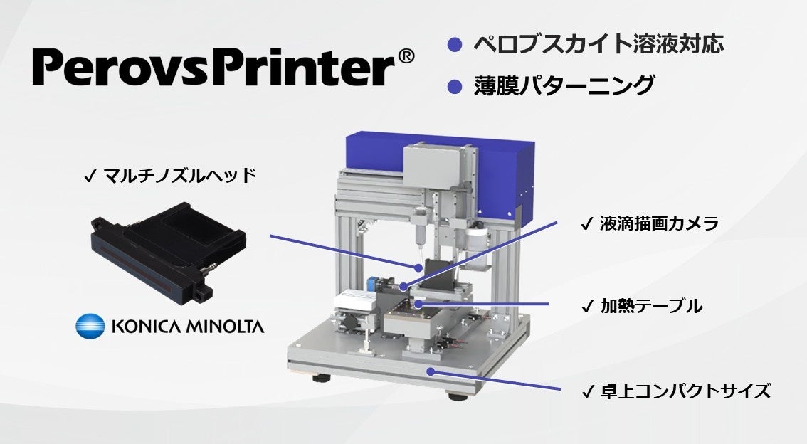 新しく販売するPerovsPrinterは、高耐液のコニカミノルタ社製インクジェットヘッドを搭載しており、DMFやDMSOを溶媒とするペロブスカイト前駆体溶液への耐性が高く、ペロブスカイト層の薄膜の安定形成が可能になります。
