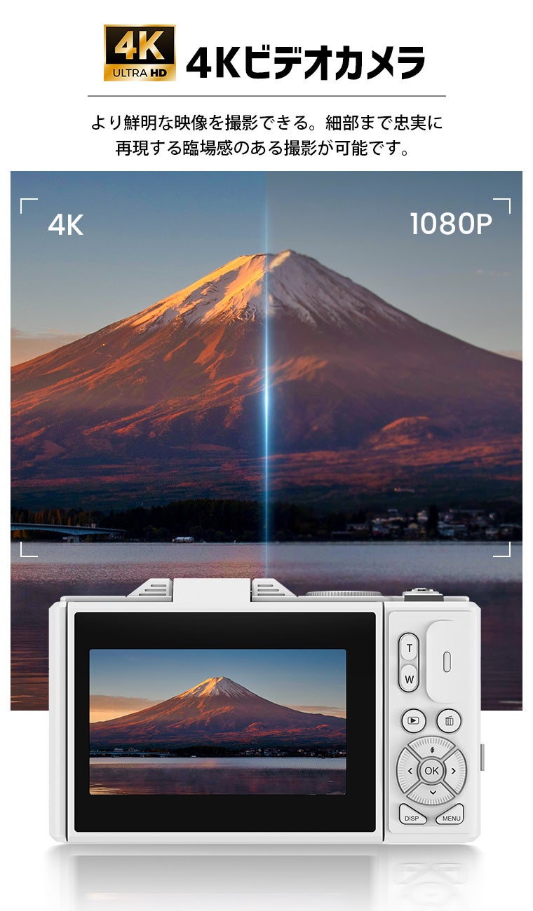 WD08は、6800万画素の高解像度センサーを搭載しており、初心者でも簡単に美しい写真を撮影することができます。また、4K動画撮影にも対応しており、細部まで鮮明な画像とクリアな動画を実現します。卒業式や入学式、旅行、日常のお出かけなど、さまざまなシーンでご利用が可能です。