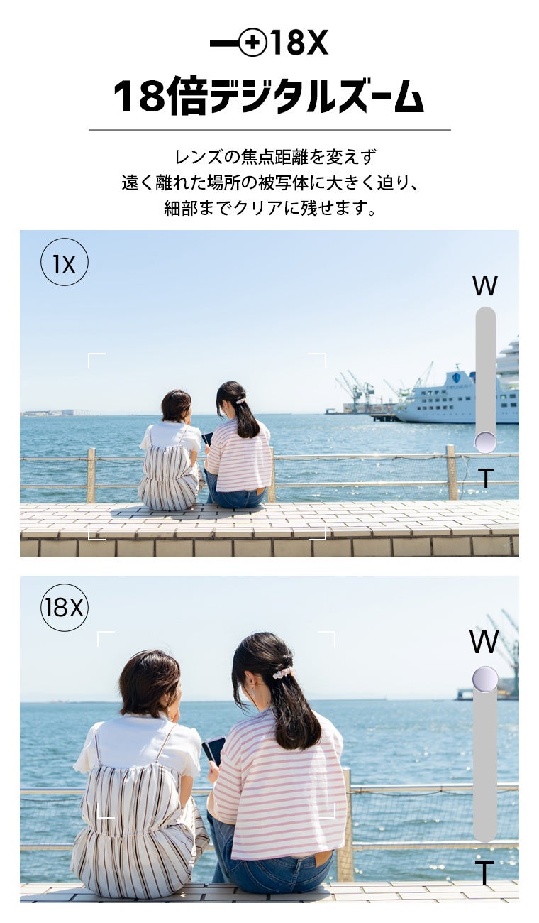18倍の光学ズーム機能で、遠くの被写体も鮮明に捉えます。