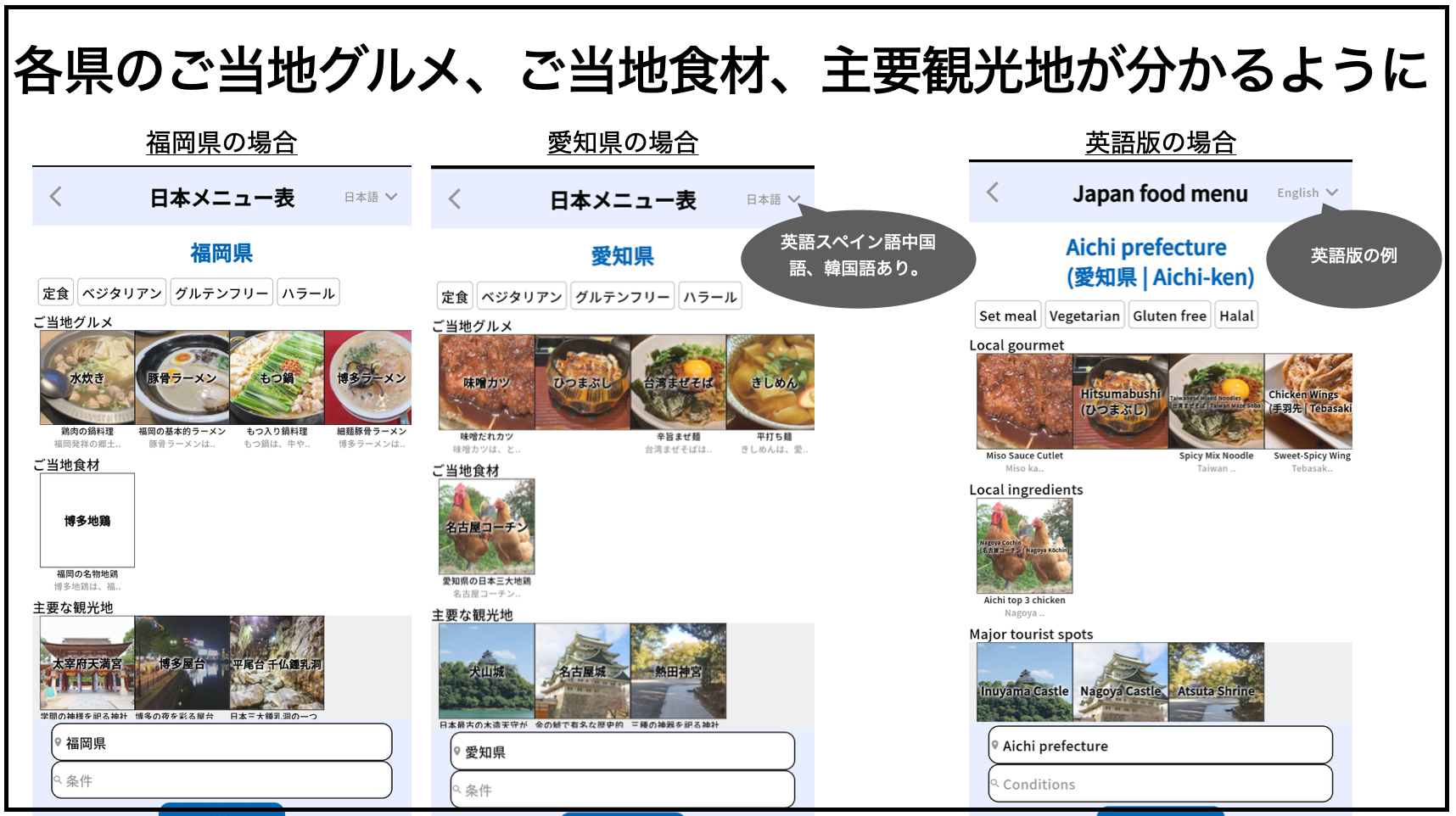日本を訪れる海外旅行者にも対応するため、英語、中国語、韓国語、スペイン語での検索機能も導入。観光情報やご当地グルメを母国語で確認できる設計となっています