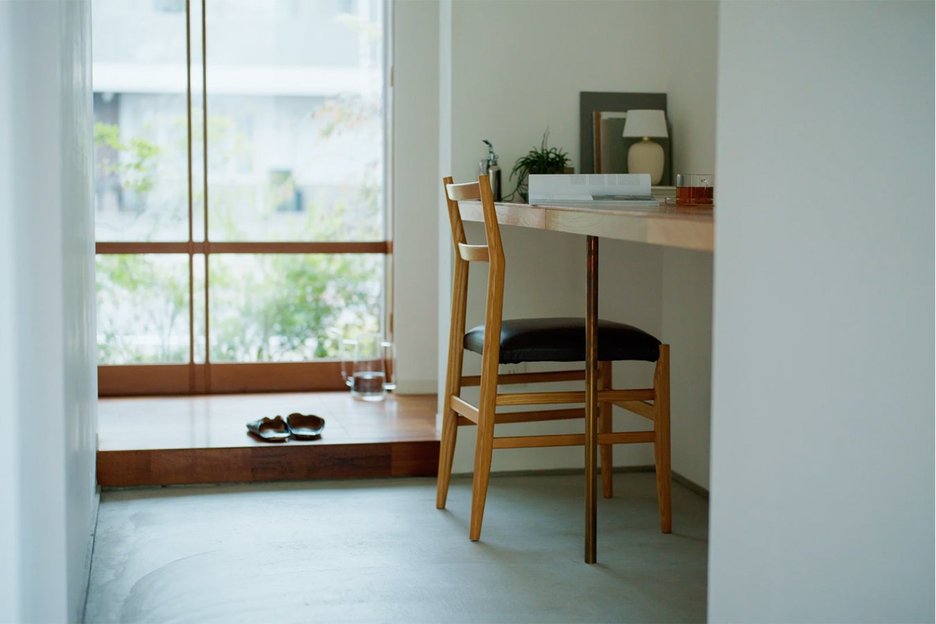 直線とわずかな曲線を使い分け、家の中で感じる “静かで穏やかなものづくり” を表現しています。
