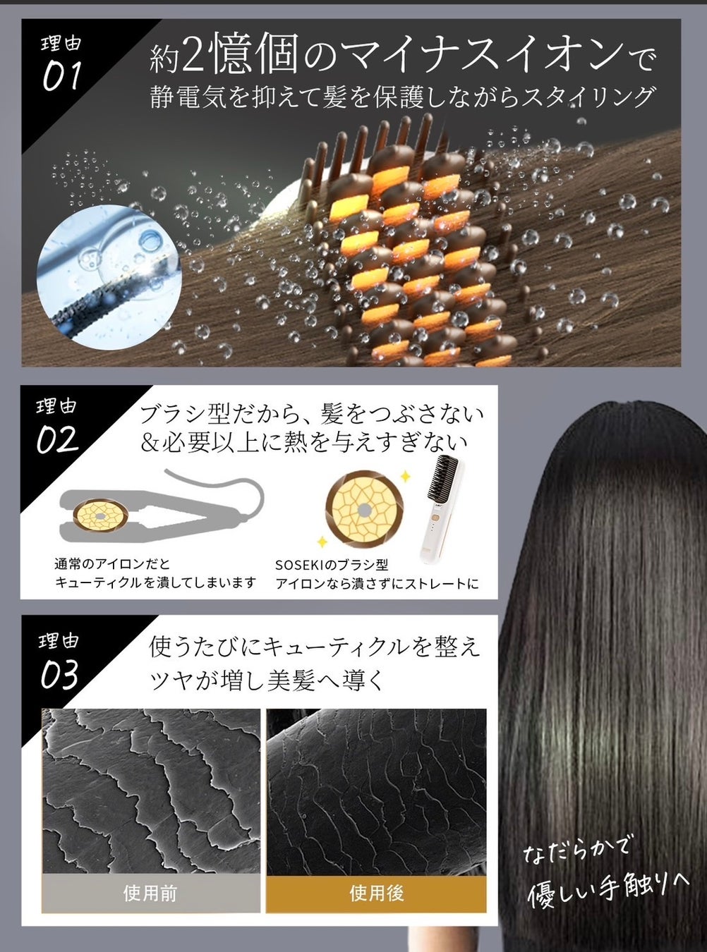 約2億個のマイナスイオンが静電気から髪を保護。使うたびにキューティクルを整え、髪に潤いと輝きを与え、滑らかな質感のある艶髪を実現。乾燥による髪のパサつきやダメージを抑えながら、美しい髪作りをサポート。