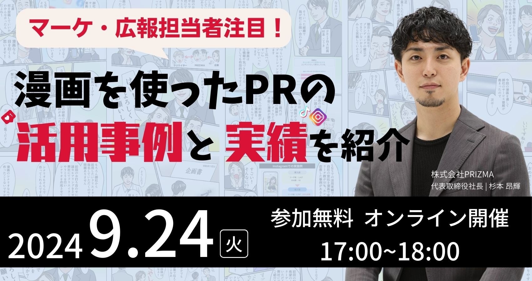 企業のPR支援プロダクト「PRIZMA」ブランドを展開する株式会社PRIZMAは、2024年9月24日(火)17:00-18:00に『マーケ・広報担当者注目/漫画を使ったPRの活用事例と実績を紹介』と題するウェビナーを開催します。