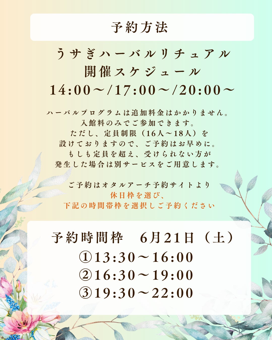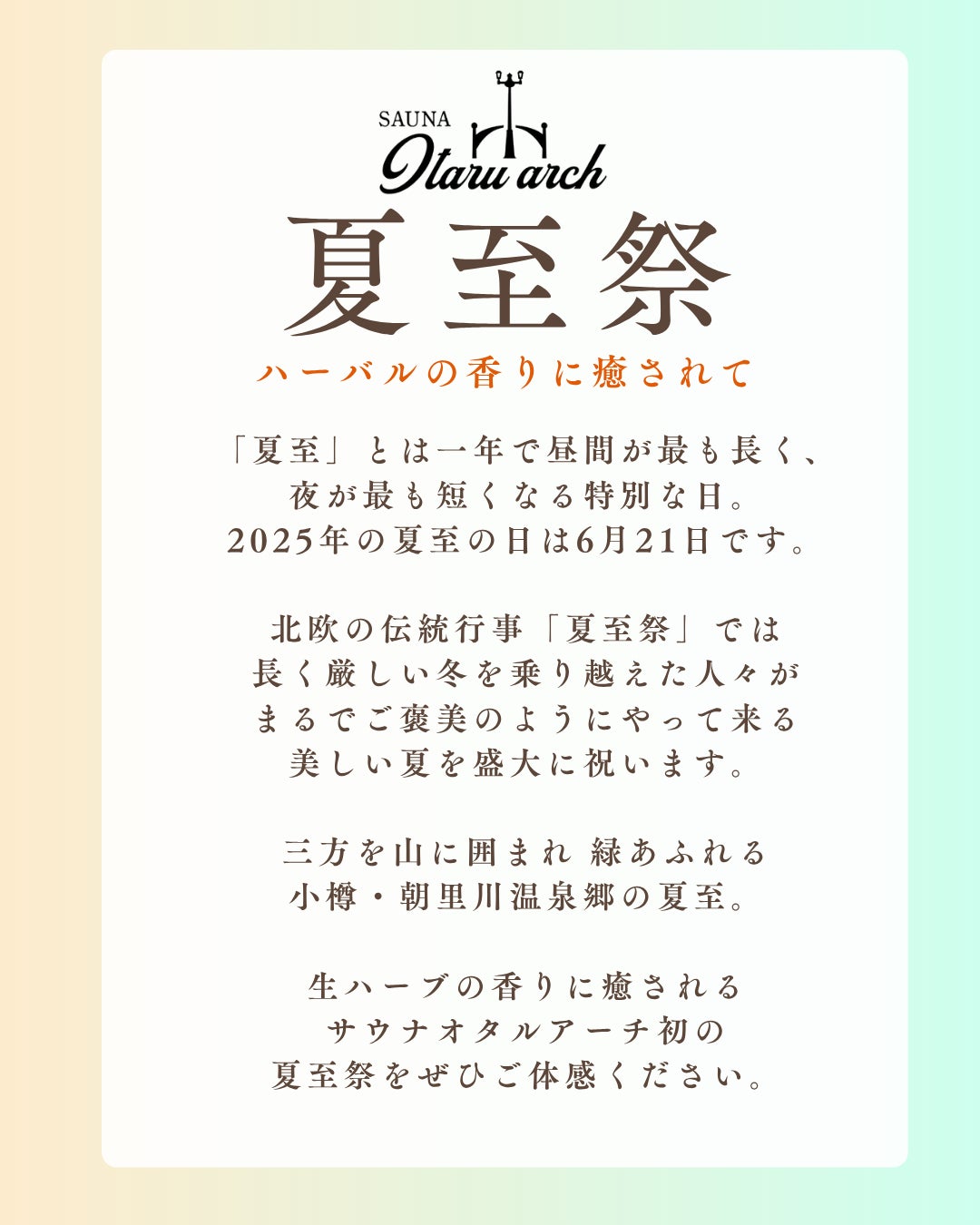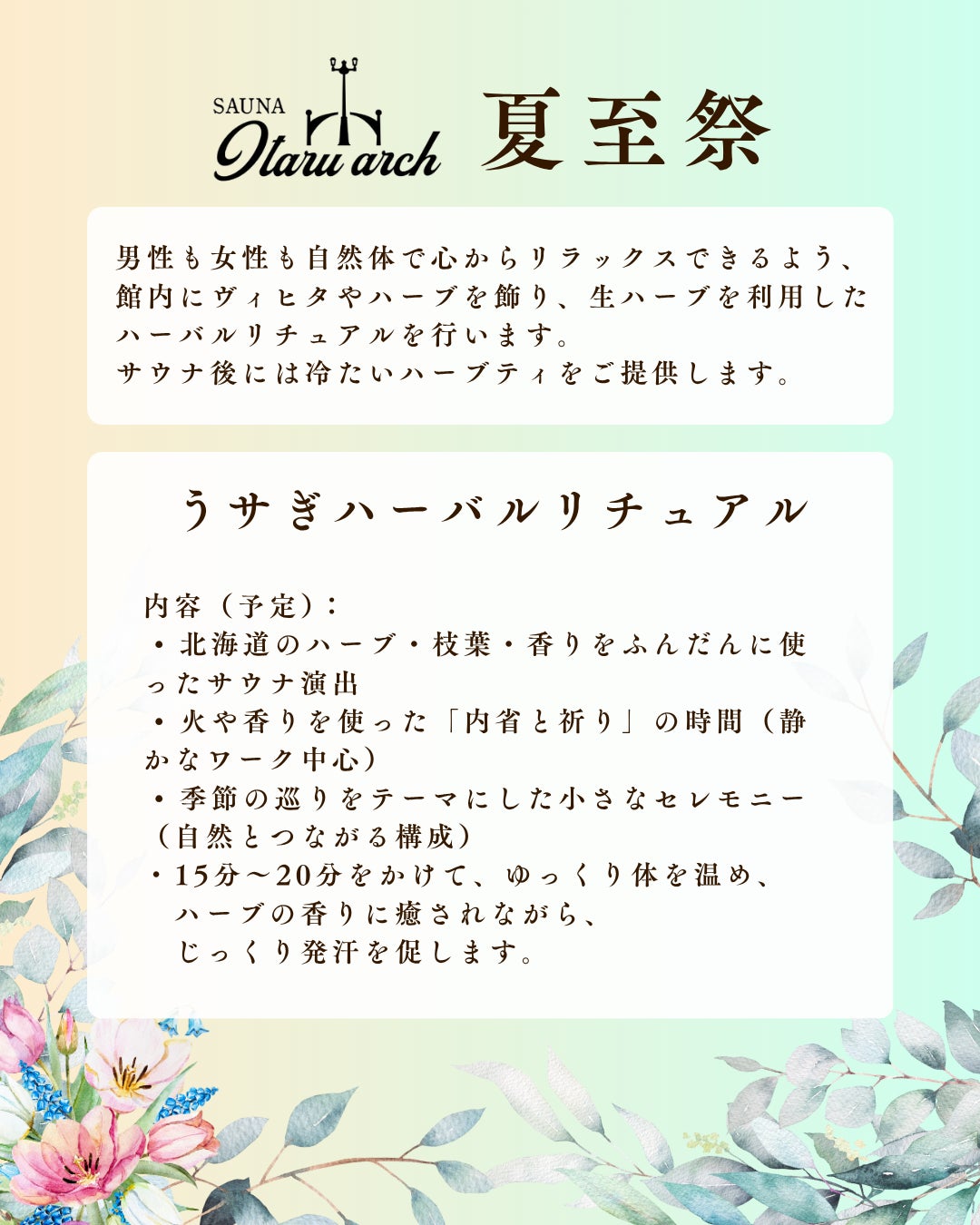 1年で昼間が最も長く、夜が最も短くなる特別な日。北欧の伝統行事「夏至祭」では長く厳しい冬を乗り越えた人々がまるでご褒美のようにやって来る美しい夏を盛大に祝います。三方を山に囲まれ 緑あふれる小樽・朝里川温泉郷の夏至を、うサぎがハーブが香るプログラムで演出します。