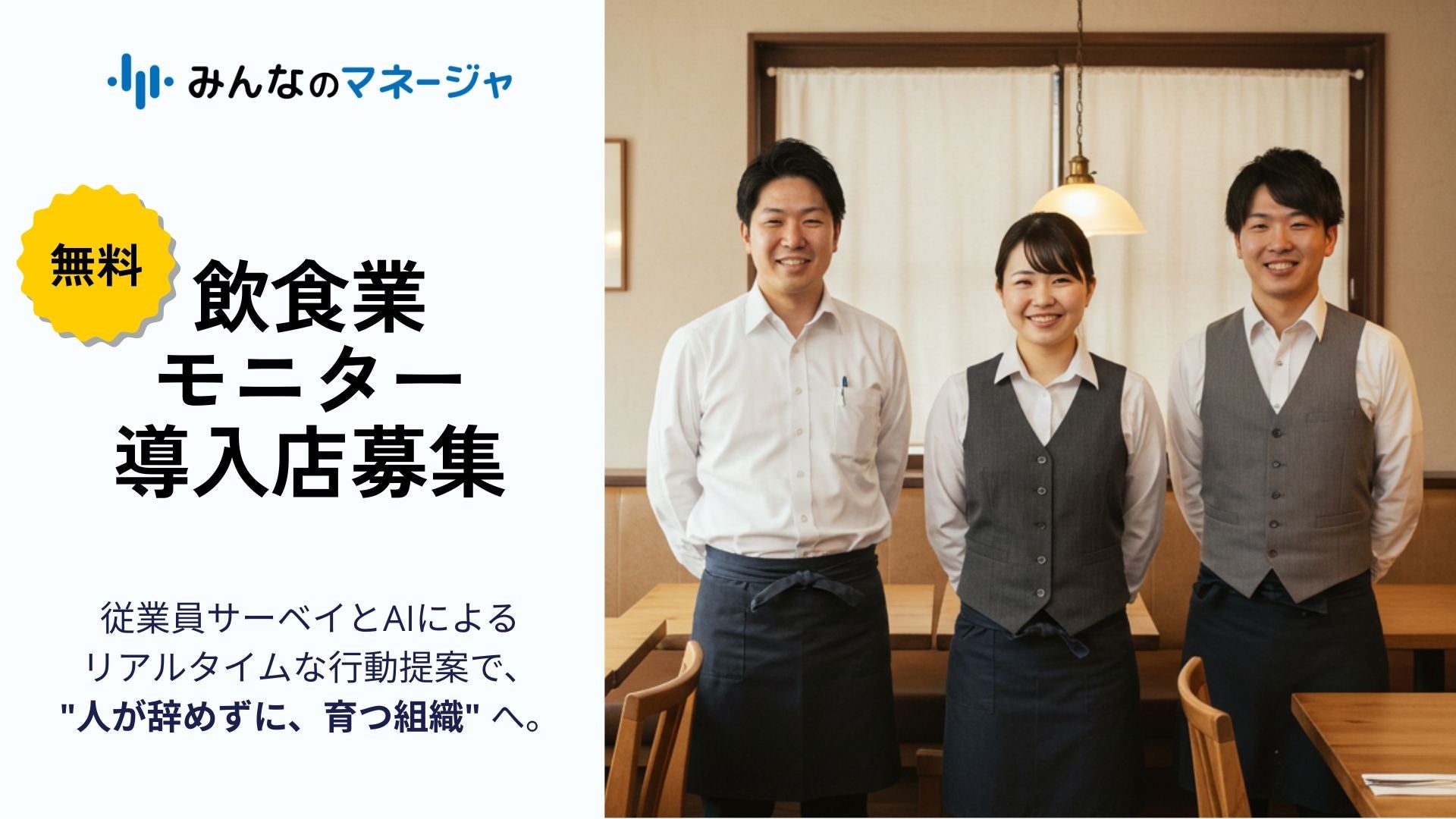 【無料モニター飲食店:100店限定募集】人材マネジメントクラウド「みんなのマネージャ」サーベイ × AIアクションで“辞めない・育つ”組織を実現