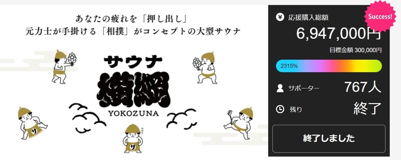 グランドオープンに向けて、昨年10月に募集した「Makuake(マクアケ)https://www.makuake.com/project/saunayokozuna/」目標金額 300,000円に対して最終的に6,947,000円・767名と大変多くの方々からご支援をいただきました。