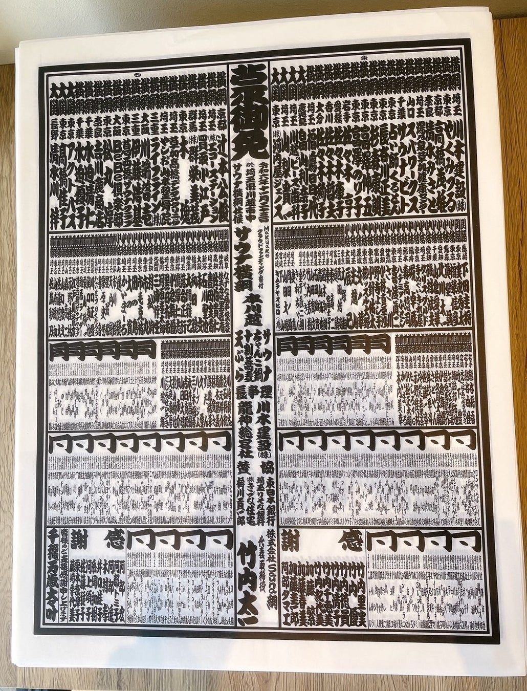 縦2メートル・横2メートルの超巨大な「板番付」には、開業にあたりご支援いただいた約600名の名前と出身地が書き入れられています。