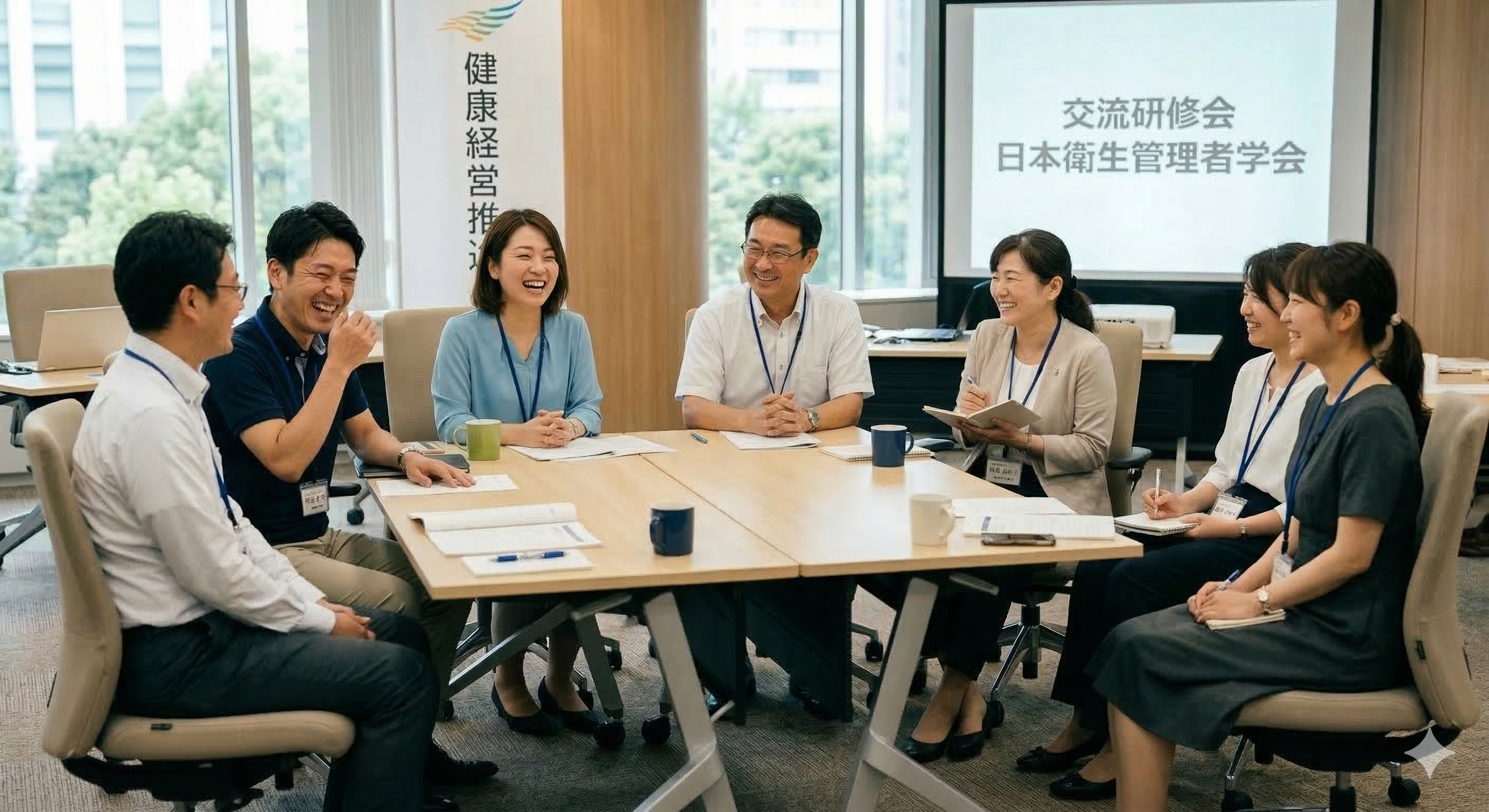 衛生管理者を中心に、人事労務担当者、産業医、産業看護職、心理職、社労士等々の多様な労働衛生スタッフで日々学び合いサポートし合っています。
