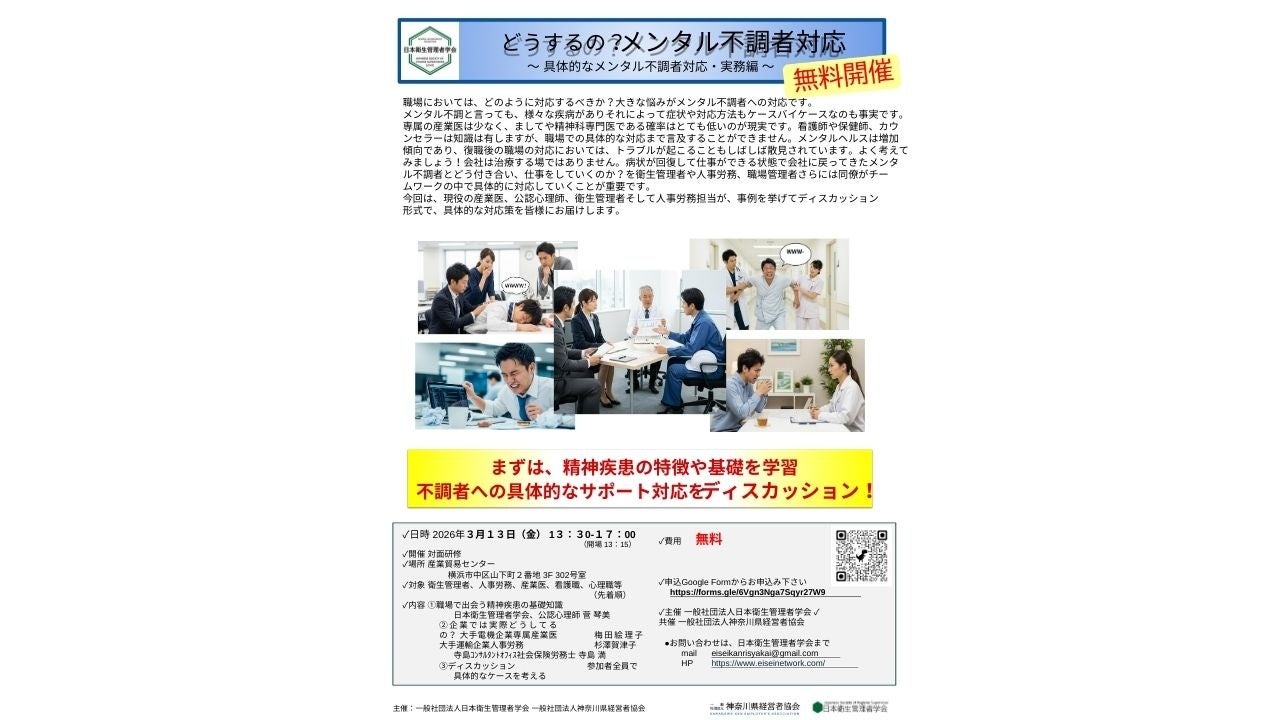一般社団法人日本衛生管理者学会(神奈川県相模原市 https://www.eiseinetwork.com/)は、変化する社会と働き方に伴う、化学物質管理、ストレス、メンタルへルスを、企業と連携・徹底サポートすべく活動している法人です。