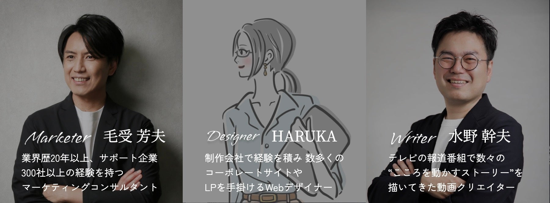 「一生懸命頑張る人を応援したい」という想いを持った3名の専門家がランディングページを作り上げます。テレビの報道番組で数々の「こころを動かすストーリー」を描いてきたライターや、経験豊富なデザイナー・マーケターが、想いを言語化・ビジュアル化していきます。