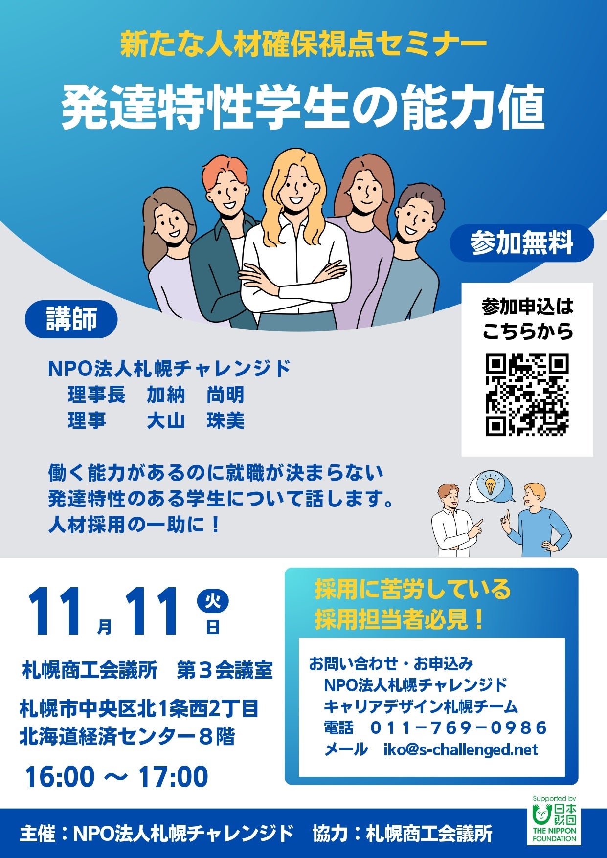人材不足や新規採用に悩みを抱えている企業の方にぜひ、新たな人材確保の視点として発達特性のある学生・若者の能力値や向き合い方などについて新たな見識を高めていただき、今後の人材採用、育成に活かしていただければ幸いです。