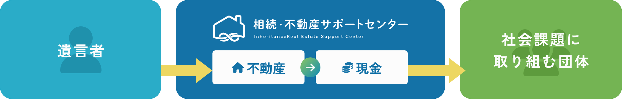 NPO法人である当サポートセンターが、相続・不動産・法律・税務の専門家と連携し、市民からの相談受付から遺言書作成・遺贈寄附の実行に至るまで一貫した支援を提供