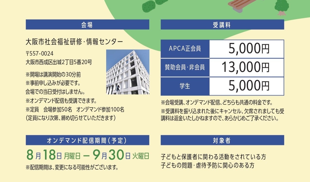 子ども虐待について関心をお持ちの方はもちろん、支援者として活動されている方も知識の整理や最新情報を得る場として、また他領域について学ぶ機会としてご参加ください。