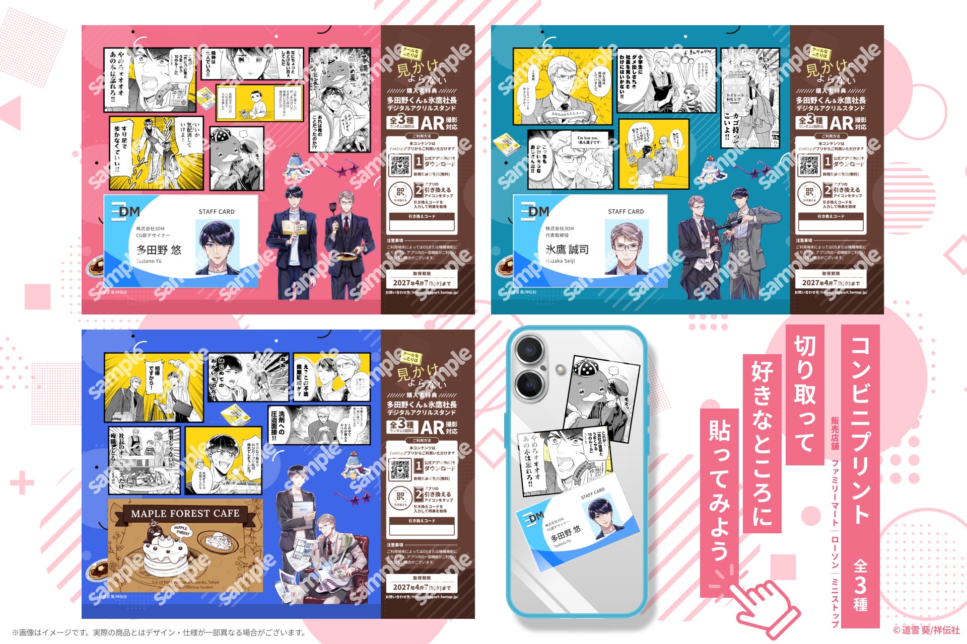 さらに、本商品のコンビニプリントにはAR対応の「デジタルアクスタ」(全3種/ランダムで1個排出)の引き換えコードがついてきます。(ARカメラはFanTopアプリ内よりご利用いただけます)