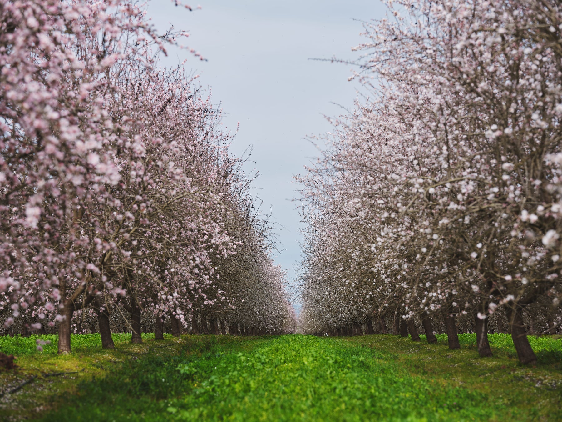 ▲春に桜に似た花を咲かすアーモンド。3 月には畑一面がピンク色に染まる。