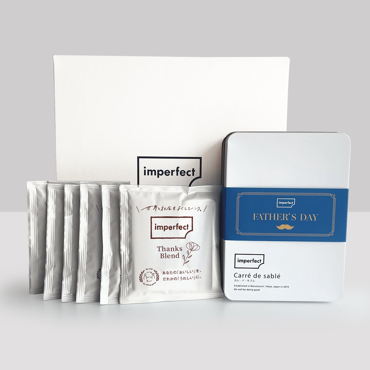 受け取っていただく方に喜んでいただきたいという気持ちを込めて父の日限定でデザインを施したカレ・ド・サブレと、厳選したドリップバッグコーヒーThanks Blendをセットにした「父の日限定ギフトボックス」。