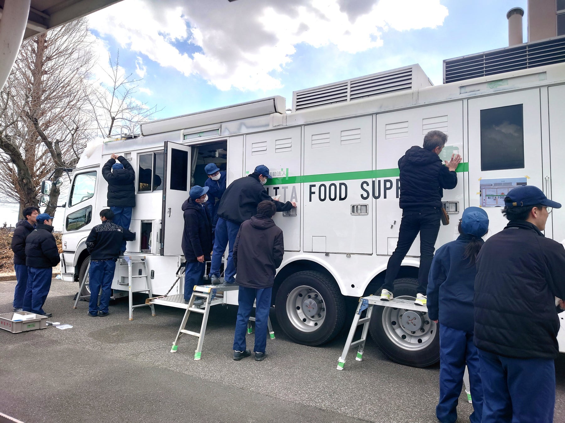 今回のプロジェクト当社 統括部長星野茂の起案によりスタートいたしました。災害が多発する昨今当社では東日本大震災で宮城県へ支援物資としてパンを1万食寄付、その後の台風19号の水害では片づけボランティアで参加、能登地震では石川県にパン3千食を寄付してまいりました。星野はこれまでの当社で行ってきた被災地支援の窓口として対応にあたっておりました。現地にも赴き、被災地支援を行う中で現地の人々に温かい食事を提供したいと考えた星野は社内で本プロジェクトを起案、当社としても被災地の人々に温かい食事を提供し少しでも心安らぐ時間の提供が出来ればと2023年1月にキッチンカー制作プロジェクトを星野茂をリーダーとして立ち上げましました。